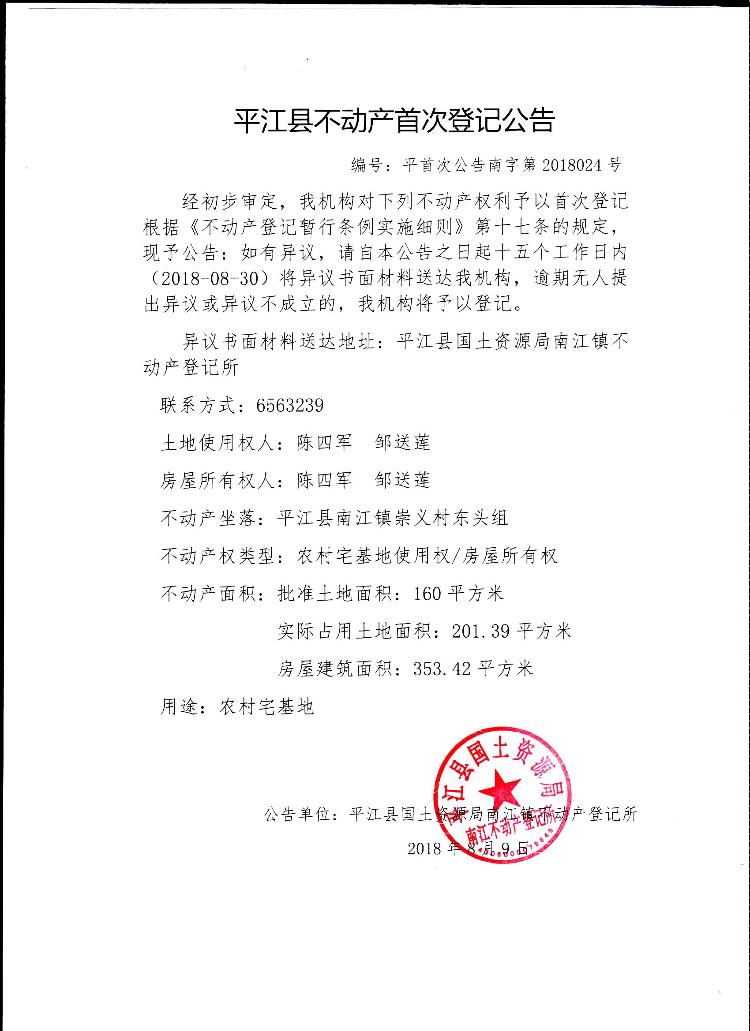 陈四军 邹送莲平江县不动产首次登记公告平首次公告南字第2018024号