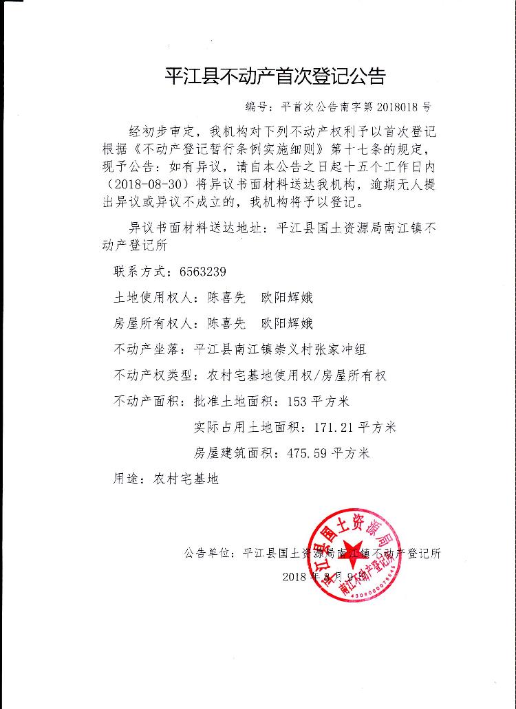 陈喜先 欧阳辉娥平江县不动产首次登记公告平首次公告南字第2018018号