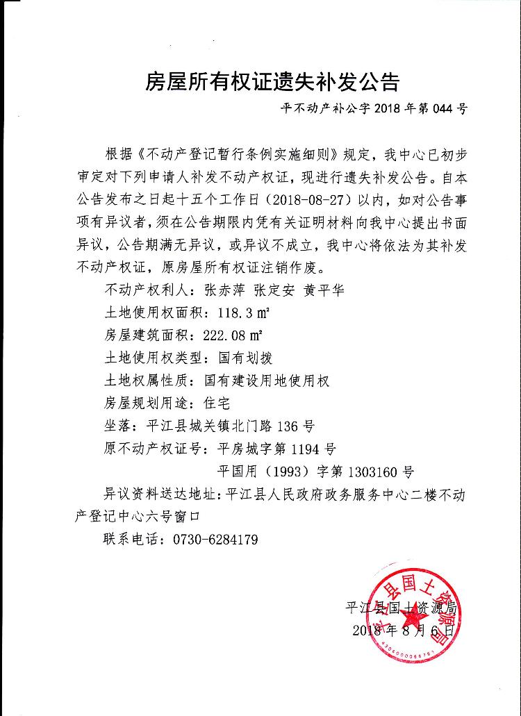 张赤萍 张定安 黄平华房屋所有权证遗失补发公告平不动产补公字2018年第044号