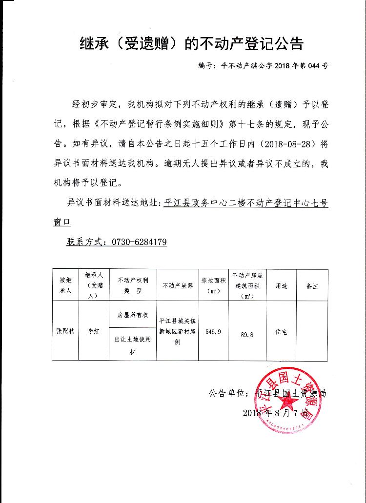 李红继承(受遗赠)的不动产登记公告平不动产继公字2018年第044号