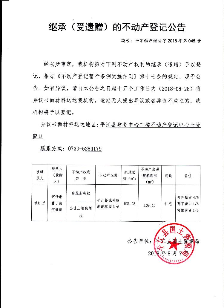 何仟勤 曹丁南 何僖南继承(受遗赠)的不动产登记公告平不动产继公字2018年第045号