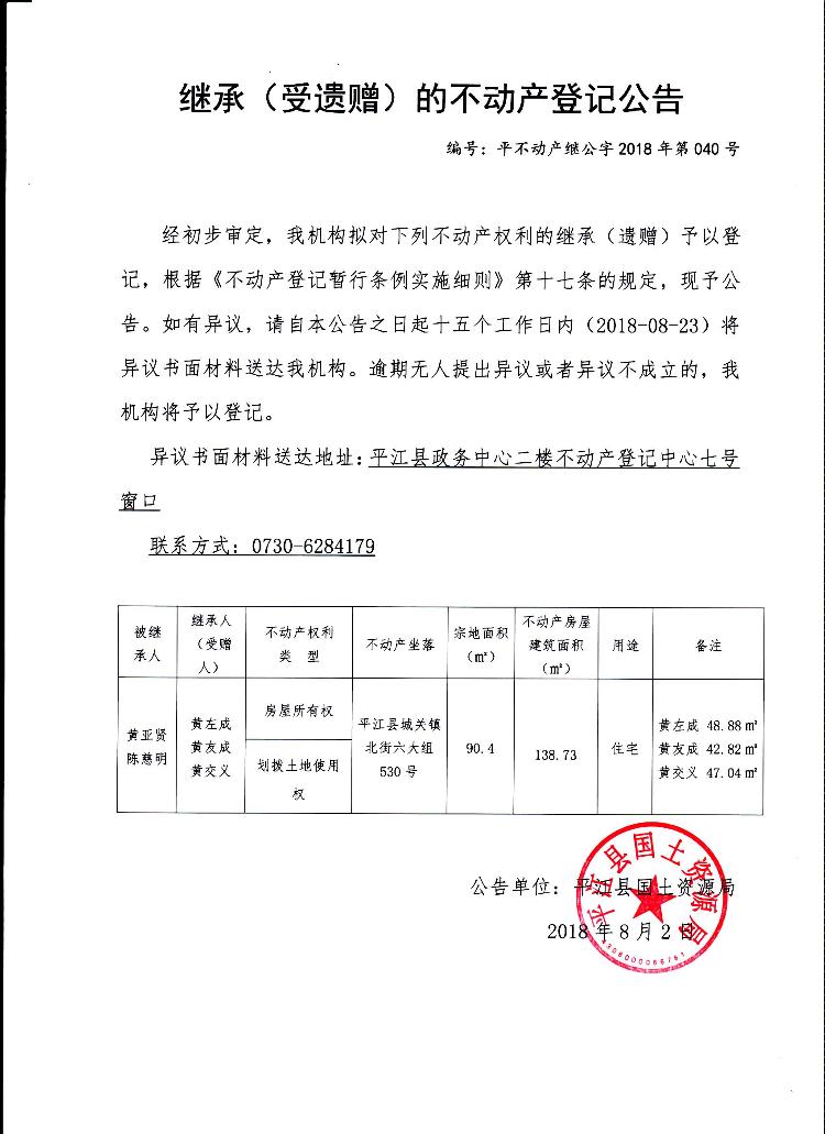 黄左成 黄友成 黄交义继承(受遗赠)的不动产登记公告平不动产继公字2018年第040号