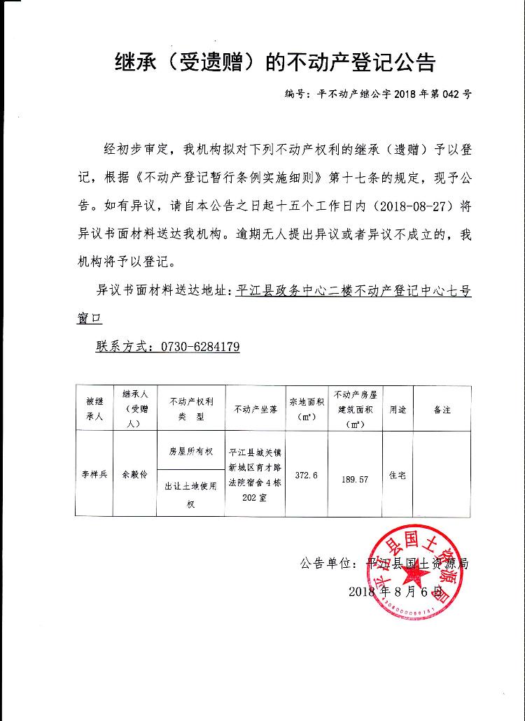余毅伶继承(受遗赠)的不动产登记公告平不动产继公字2018年第042号