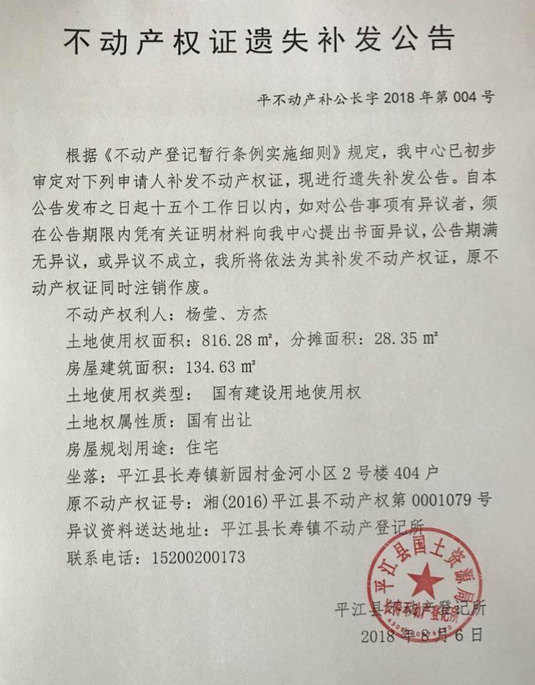 杨莹 方杰不动产权证遗失补发公告平不动产补公长字2018年第004号