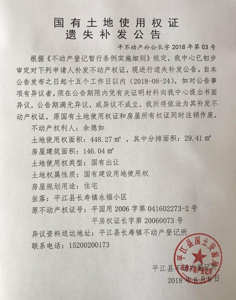余德如国有土地使用权证遗失补发公告平不动产补公长字2018年第03号