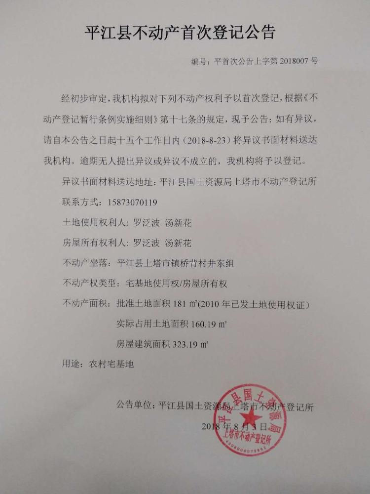 罗泛波 汤新花不动产首次登记公告平首次公告上字第2018007号