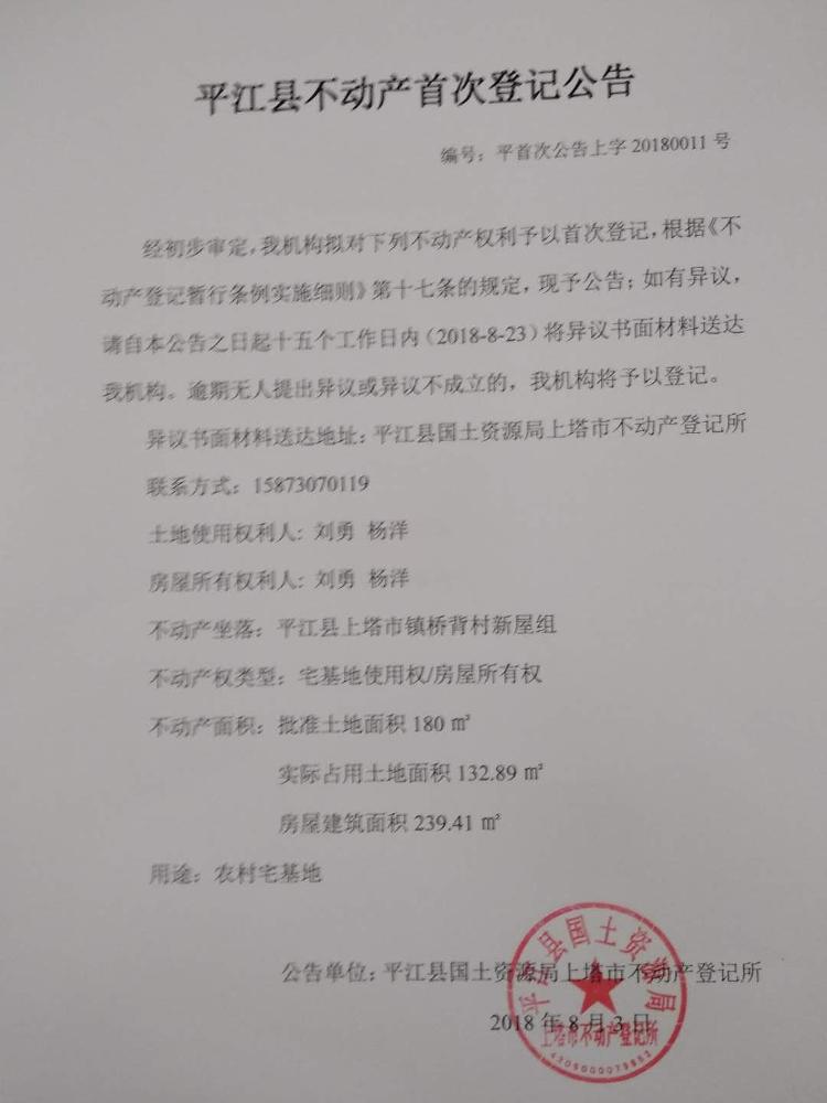 刘勇 杨洋不动产首次登记公告平首次公告上字20180011号