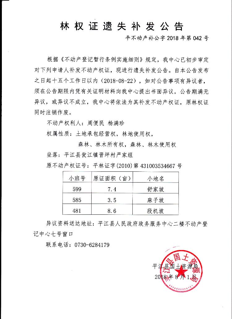 周便民 杨满珍林权证遗失补发公告平不动产补公字2018年第042号
