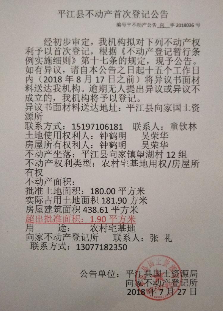 钟鹤明 吴荣华不动产首次登记公告 向字2018036