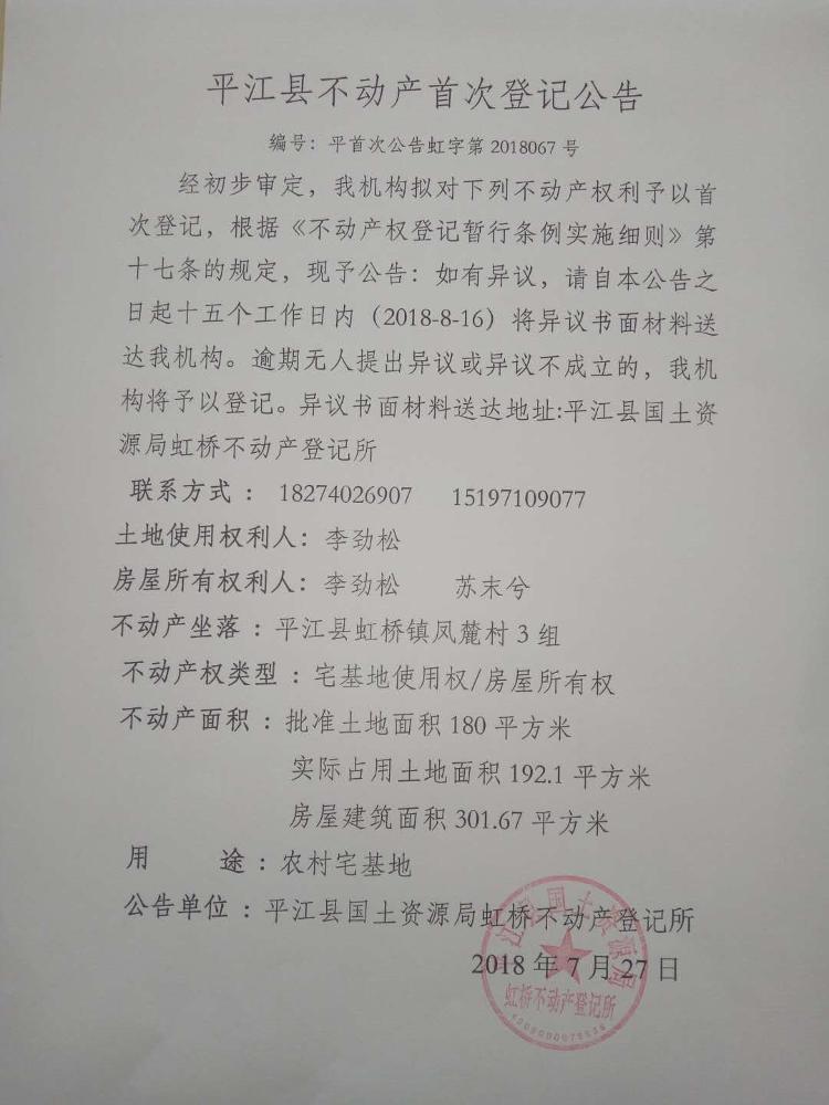 李劲松 苏末兮不动产首次登记公告平首次公告虹字第2018067号
