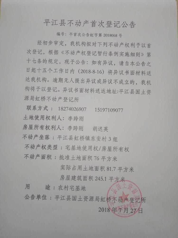 李跨刚 胡迟英不动产首次登记公告平首次公告虹字第2018068号