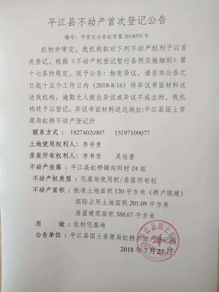 李书贵 吴祉香不动产首次登记公告平首次公告虹字第2018070号