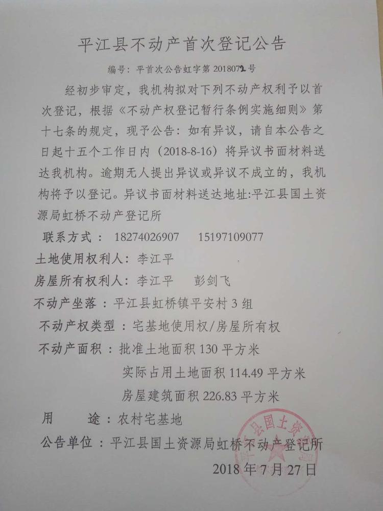 李江平 彭剑飞不动产首次登记公告平首次公告虹字第2018072号