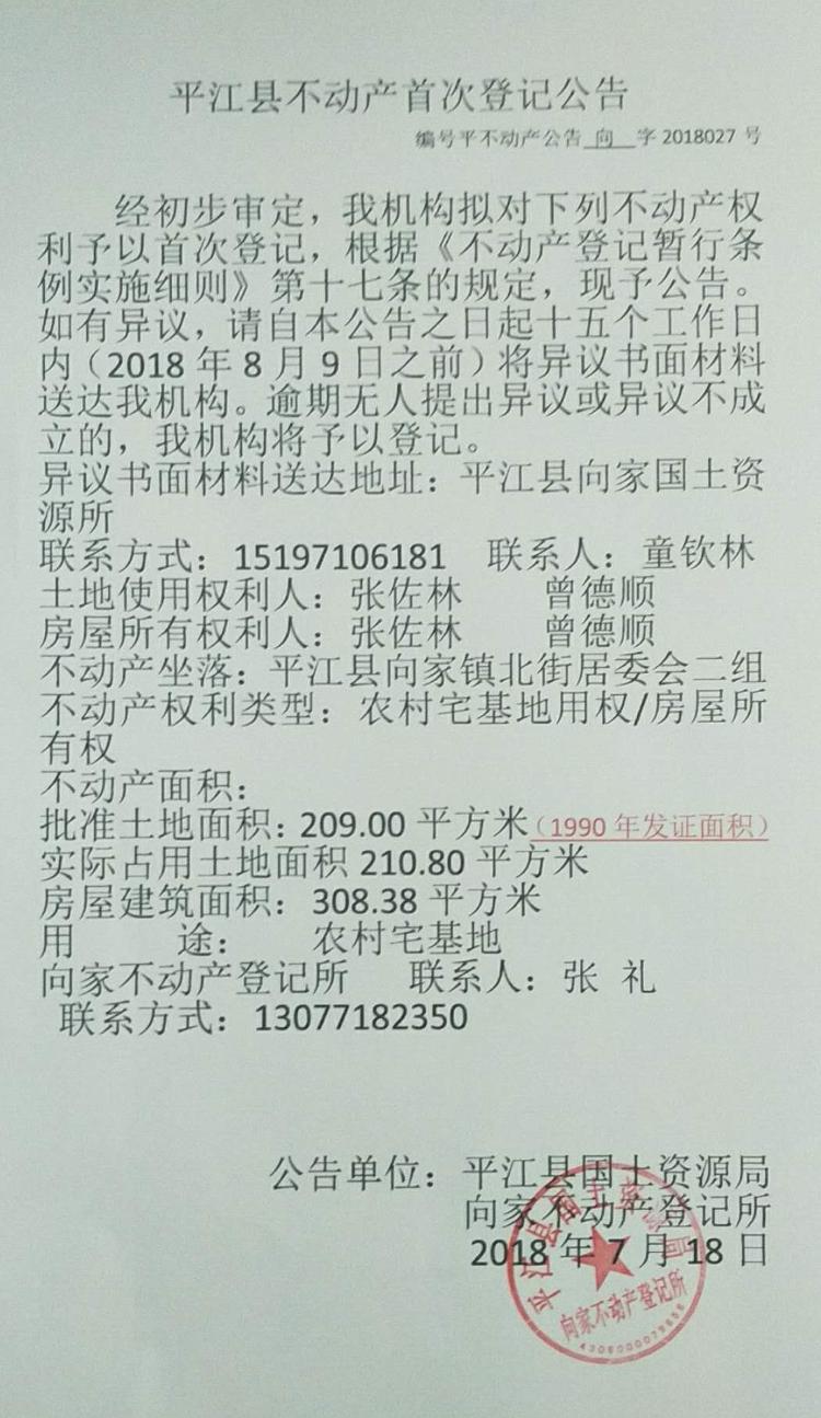 张佐林 曾德顺不动产首次登记公告 向字2018027