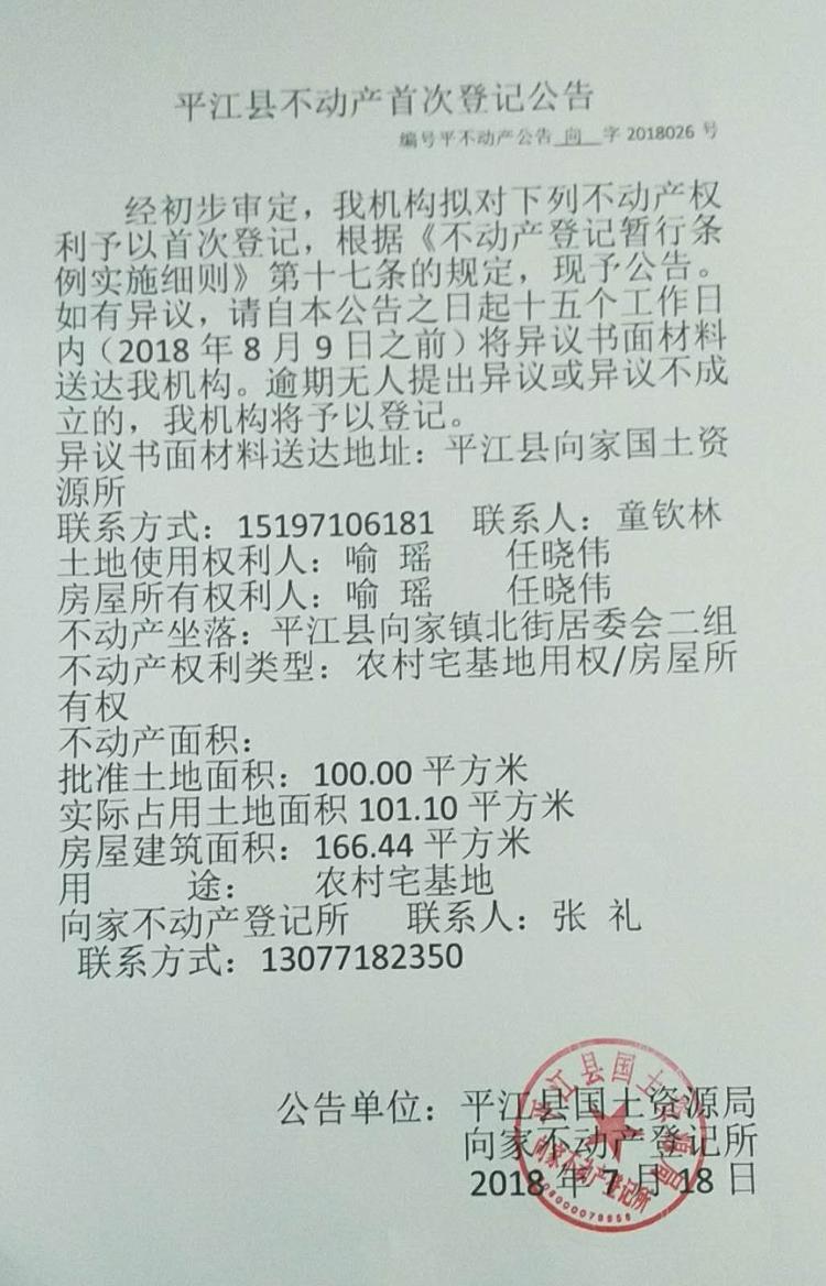 喻瑶 任晓伟不动产首次登记公告 向字2018026