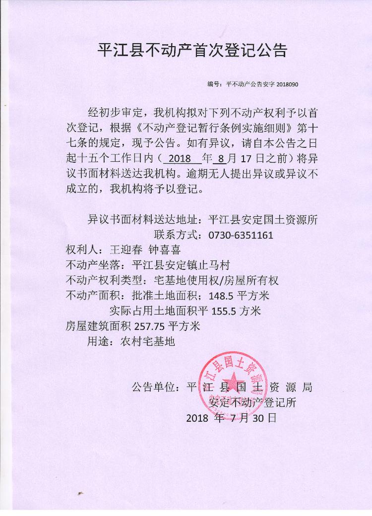 王迎春 钟喜喜不动产首次登记公告 安字2018090