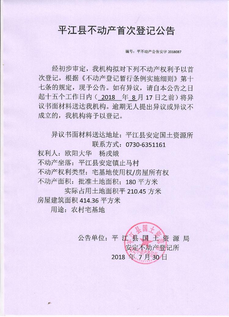 欧阳大华 杨戍娥不动产首次登记公告 安字2018087