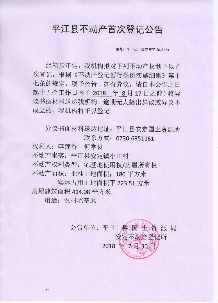 李莲香 何学良不动产首次登记公告 安字2018084