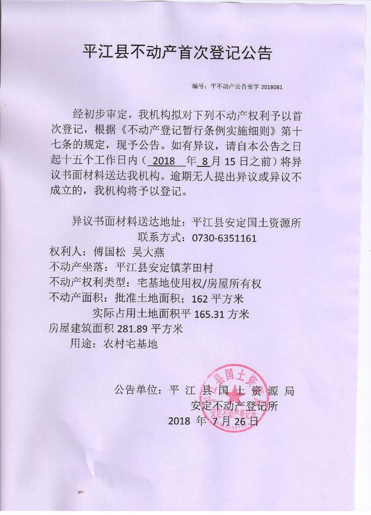 傅国松 吴大燕不动产首次登记公告 安字2018081