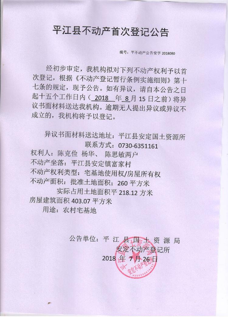 陈克俭 杨华 陈思敏不动产首次登记公告 安字2018080