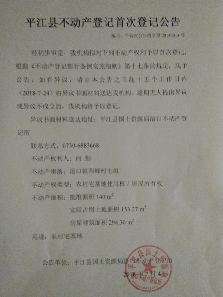 向勤不动产首次登记公告平首次公告浯字第20180018号