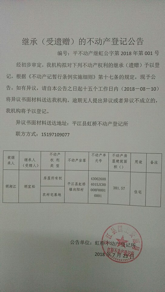 胡宜松继承(受遗赠)的不动产登记公告平不动产继虹公字2018年第001号