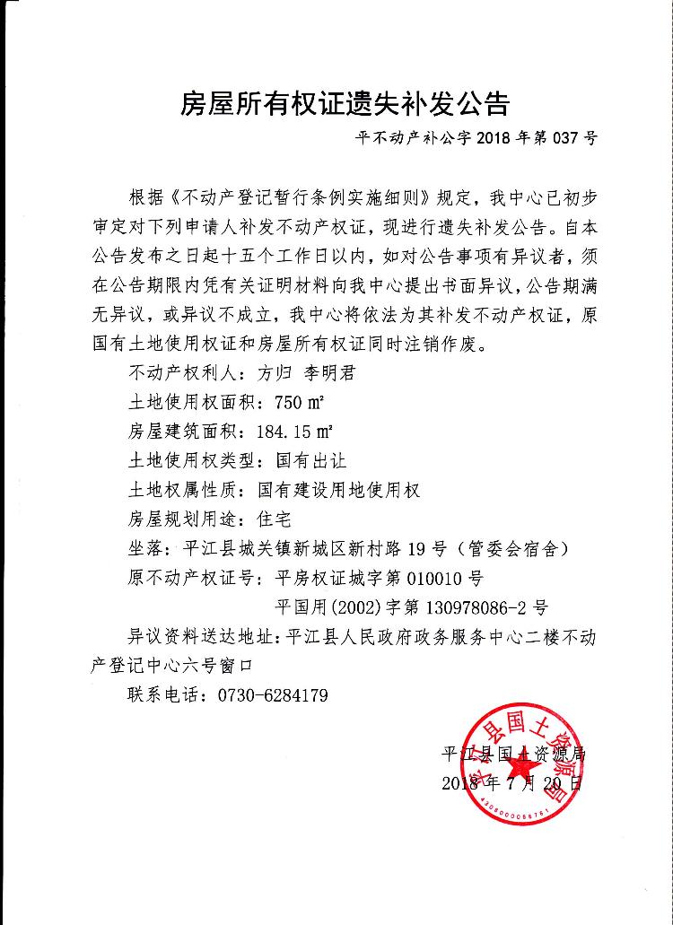 方归 李明君房屋所有权证遗失补发公告平不动产补公字2018年第037号