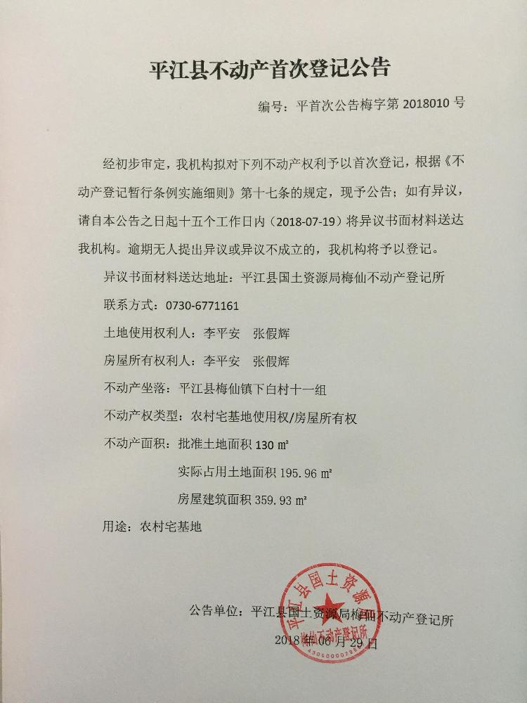 李平安 张假辉不动产首次登记公告平首次公告梅字第2018010号