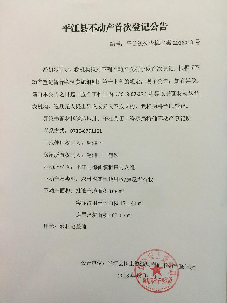 毛湘平 何妹不动产首次登记公告平首次公告梅字第2018013号