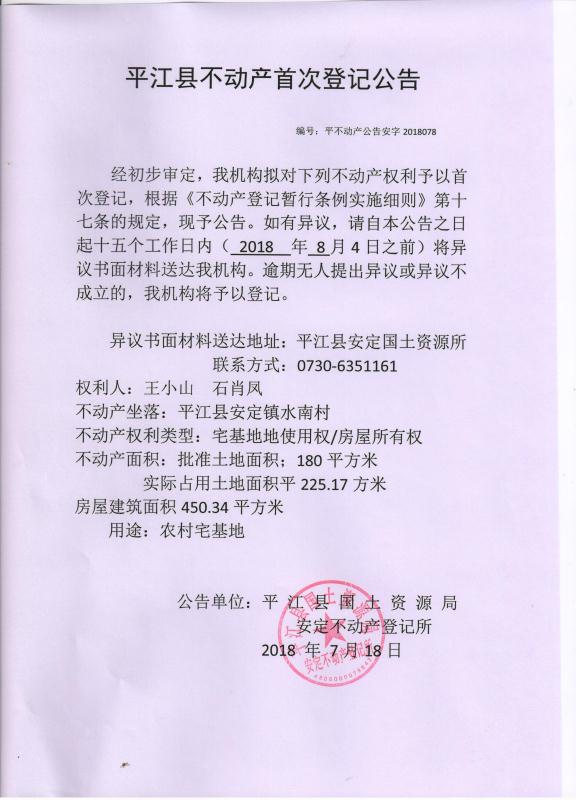王小山 石肖凤不动产首次登记公告 安字2018078