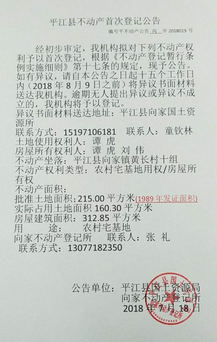 谭虎 刘伟不动产首次登记公告 向字2018019号