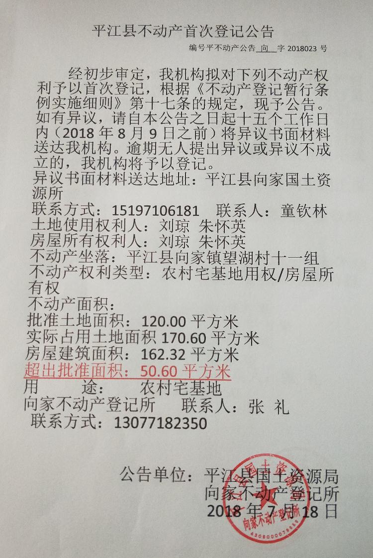 刘琼 朱怀英不动产首次登记公告 向字2018023号