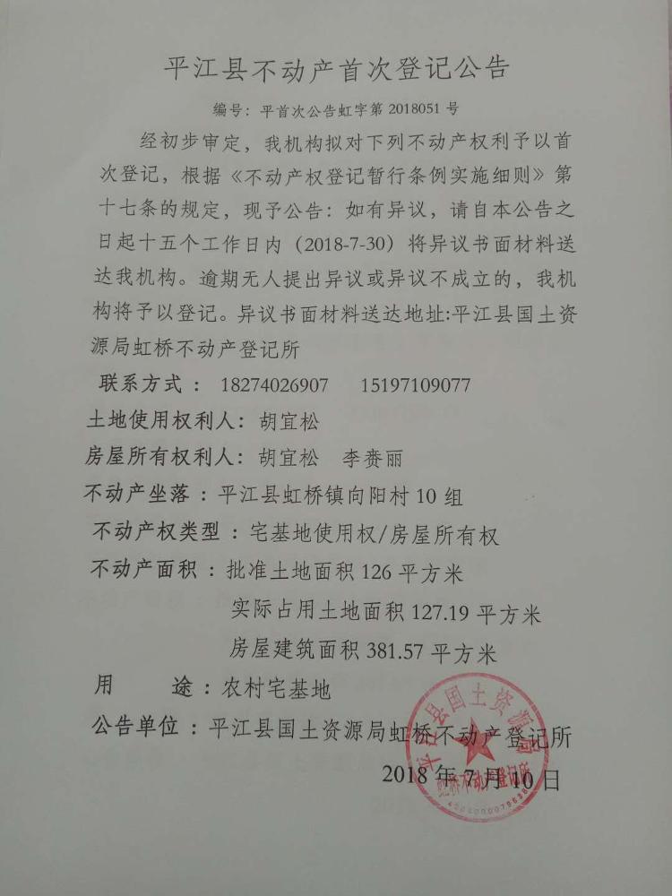 胡宜松 李赉丽不动产首次登记公告平首次公告虹字第2018051号