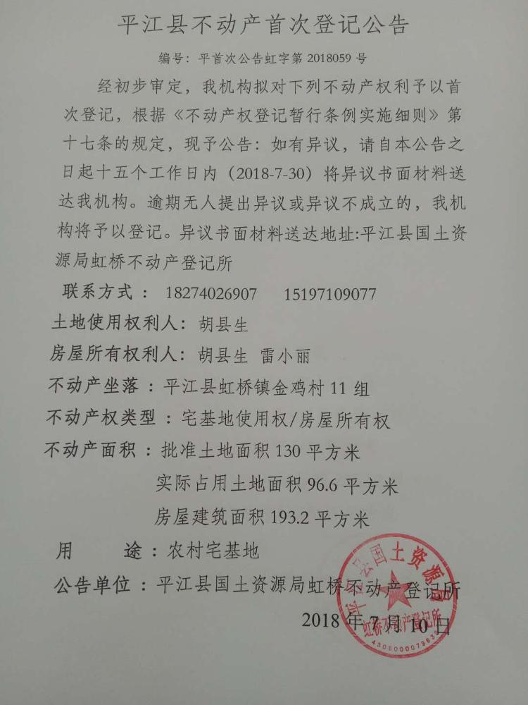 胡县生 雷小丽不动产首次登记公告平首次公告虹字第2018059号