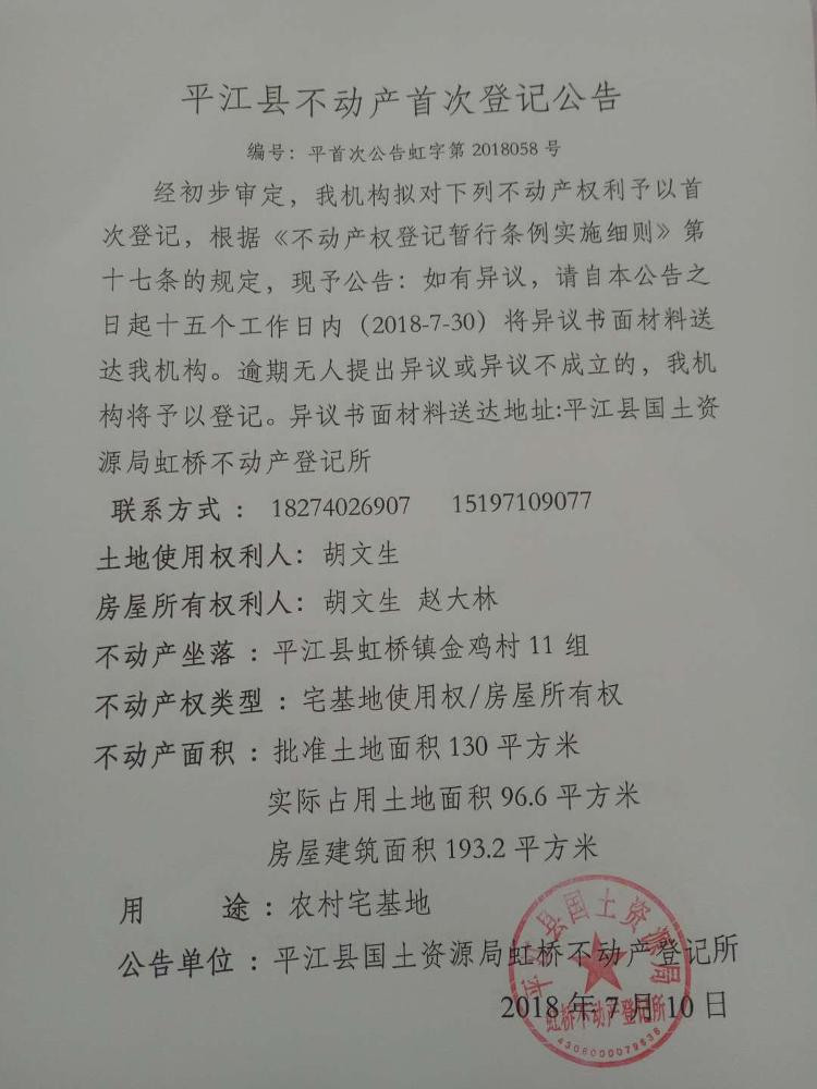 胡文生 赵大林不动产首次登记公告平首次公告虹字第2018058号