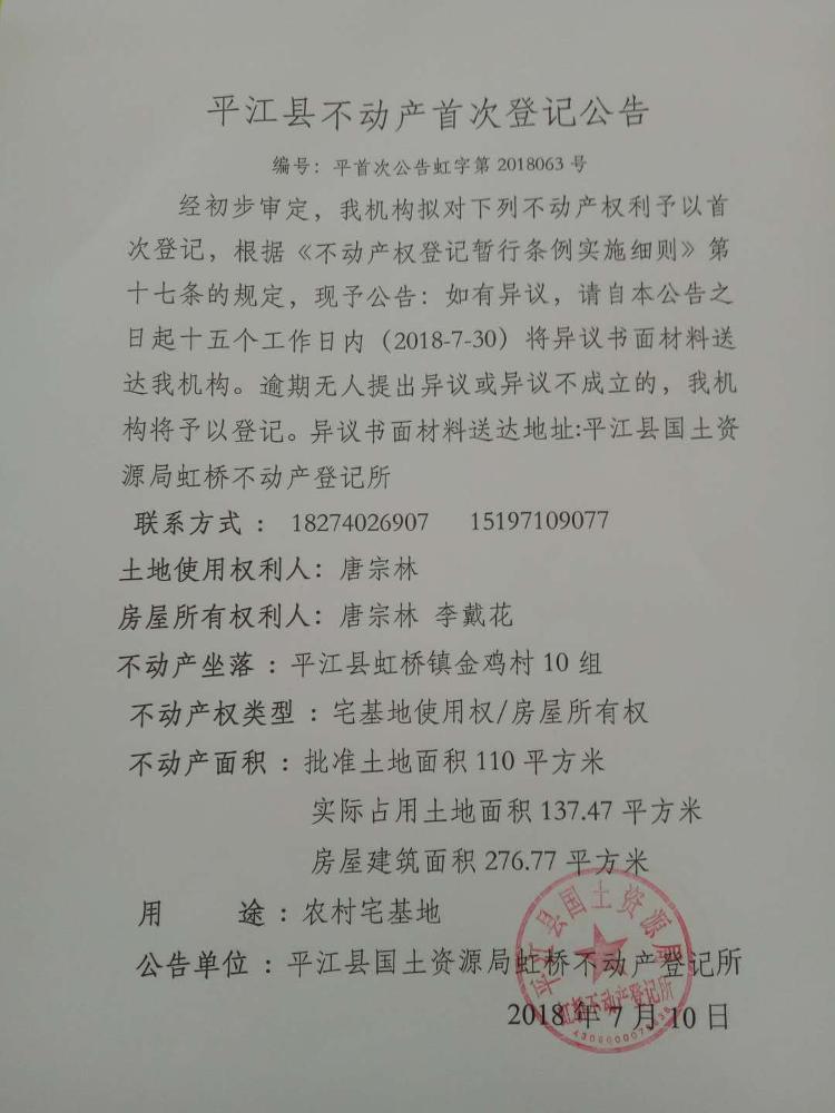 唐宗林 李戴花不动产首次登记公告平首次公告虹字第2018063号