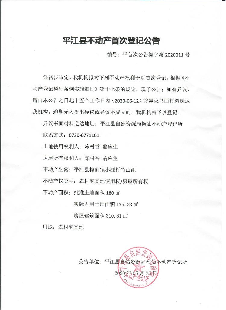 陈村香 翁应生平江县不动产首次登记公告