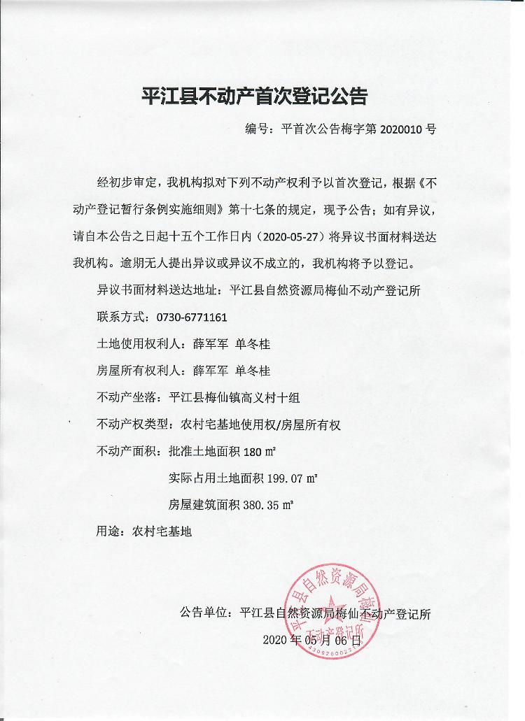 薛军军 单冬桂平江县不动产首次登记公告