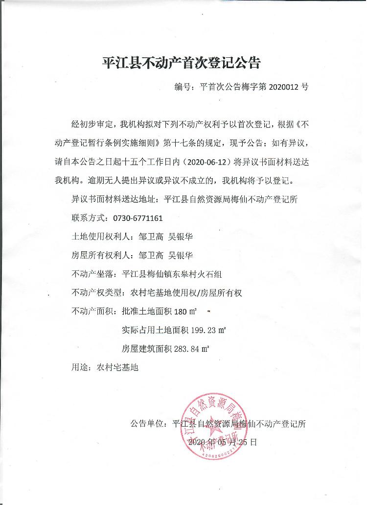 邹卫高 吴银华平江县不动产首次登记公告