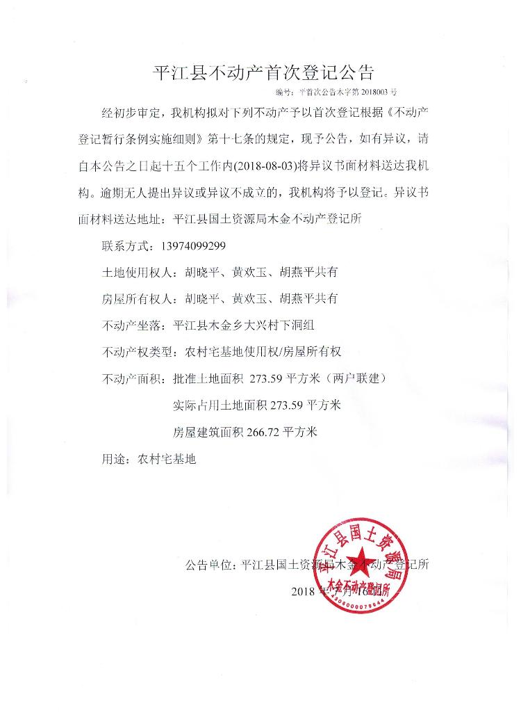 胡晓平 黄欢玉 胡燕平不动产首次登记公告平首次公告木字第2018003号