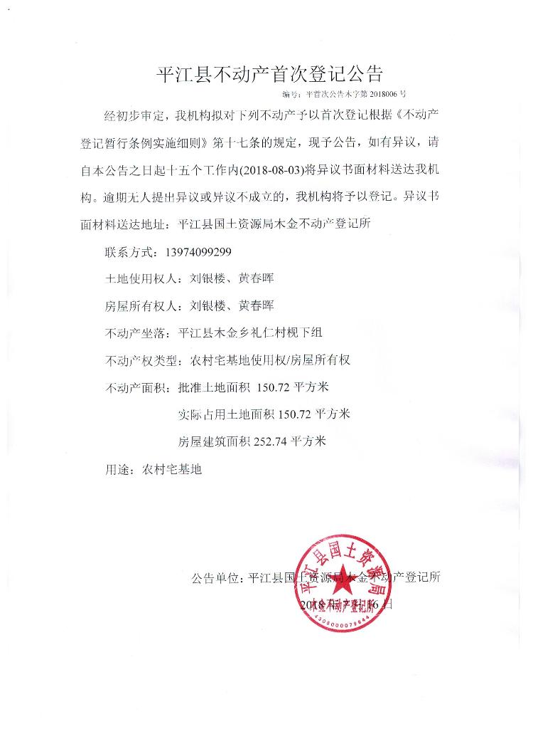 刘银楼 黄春晖不动产首次登记公告平首次公告木字第2018006号
