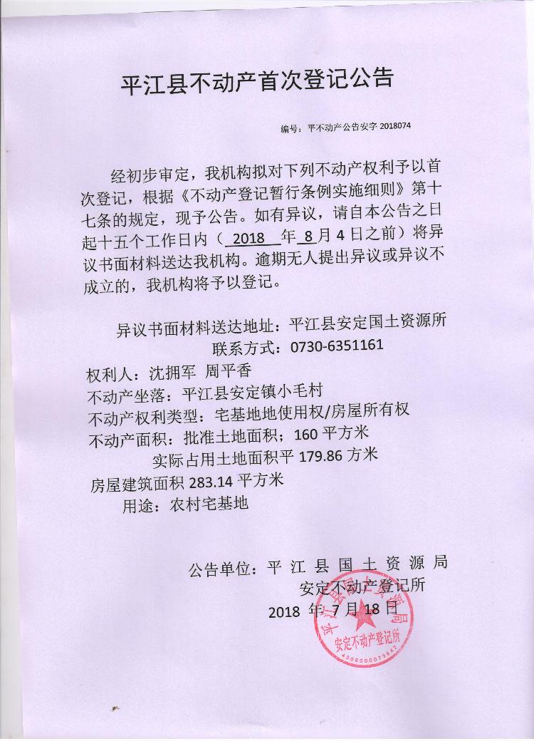 沈拥军 周平香不动产首次登记公告平不动产公告安字2018074