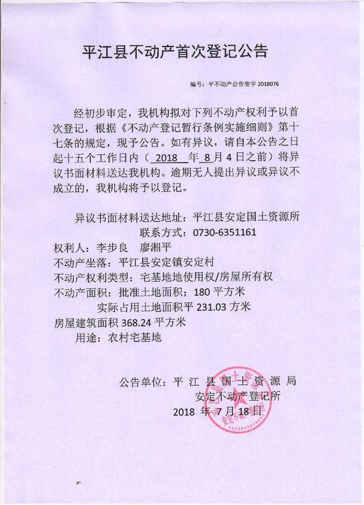 李步良 廖湘平不动产首次登记公告平不动产公告安字2018076
