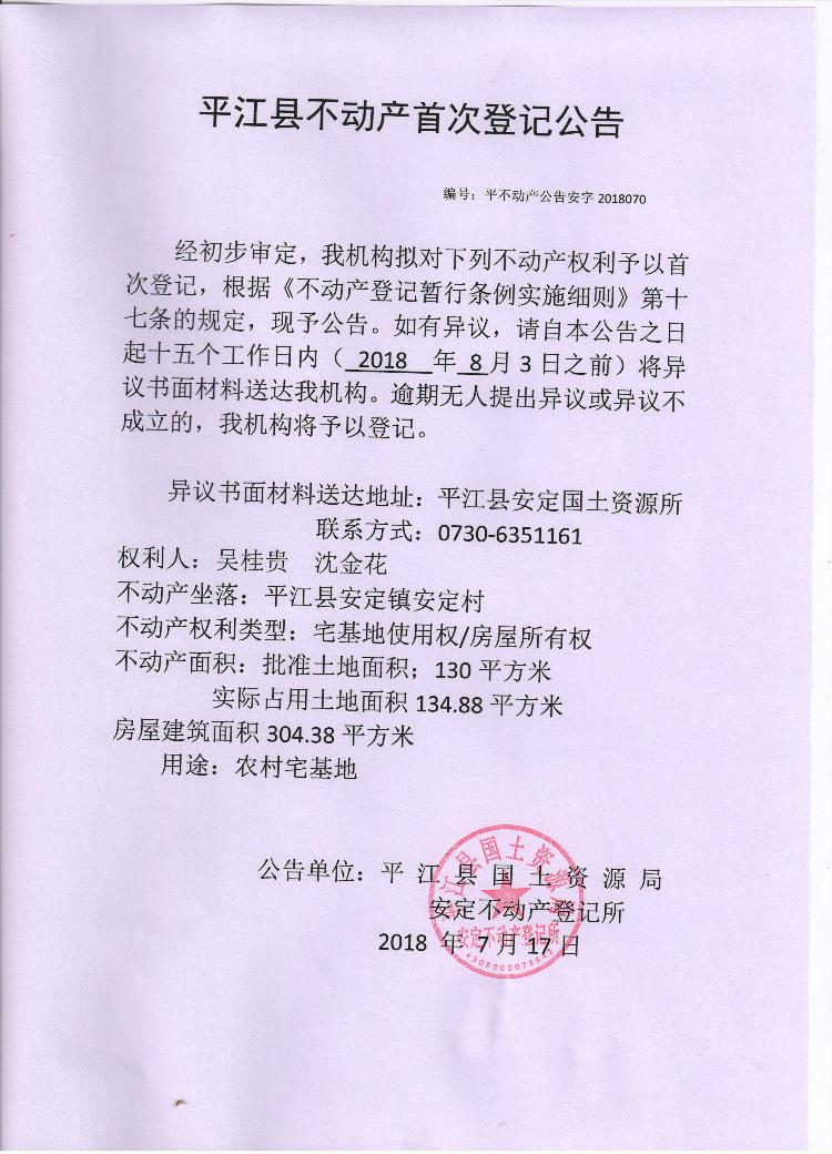 吴桂贵 沈金花不动产首次登记公告平不动产公告安字2018070