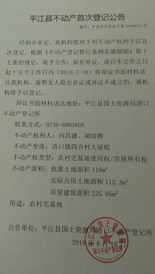 向昌盛 胡培辉不动产首次登记公告平首次公告浯字第20180013号