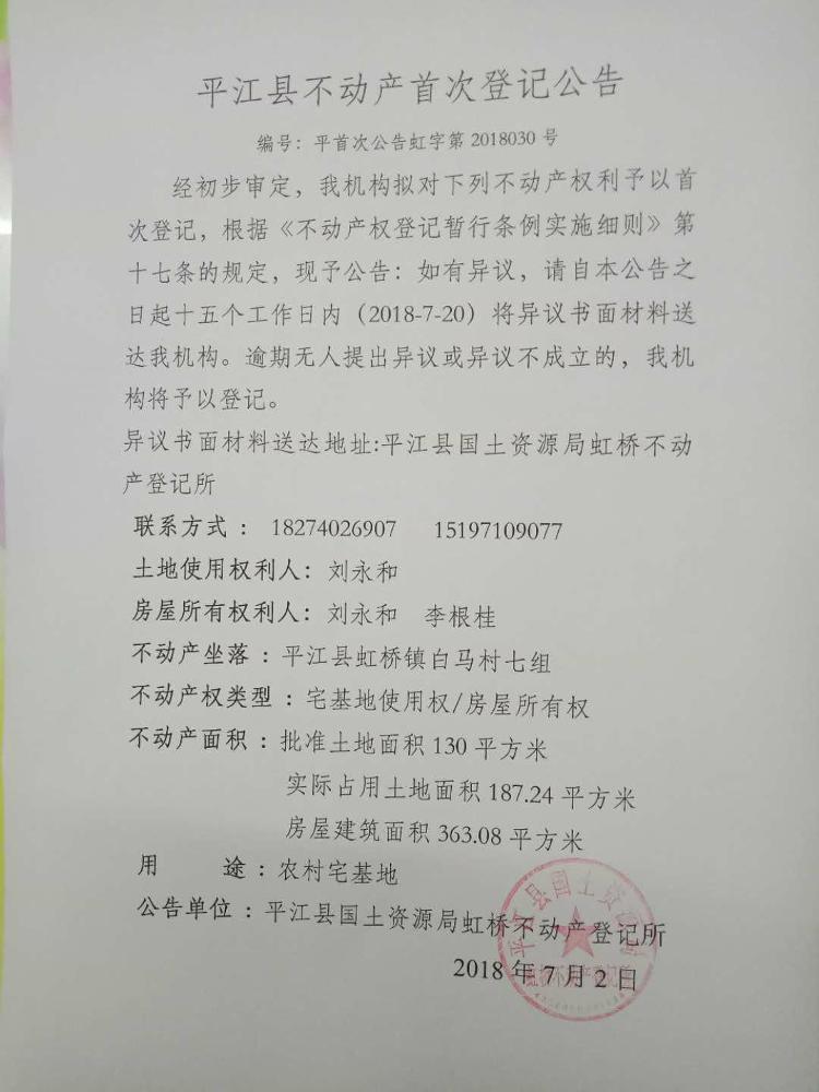 刘永和 李根桂不动产首次登记公告平首次公告虹字第2018030号