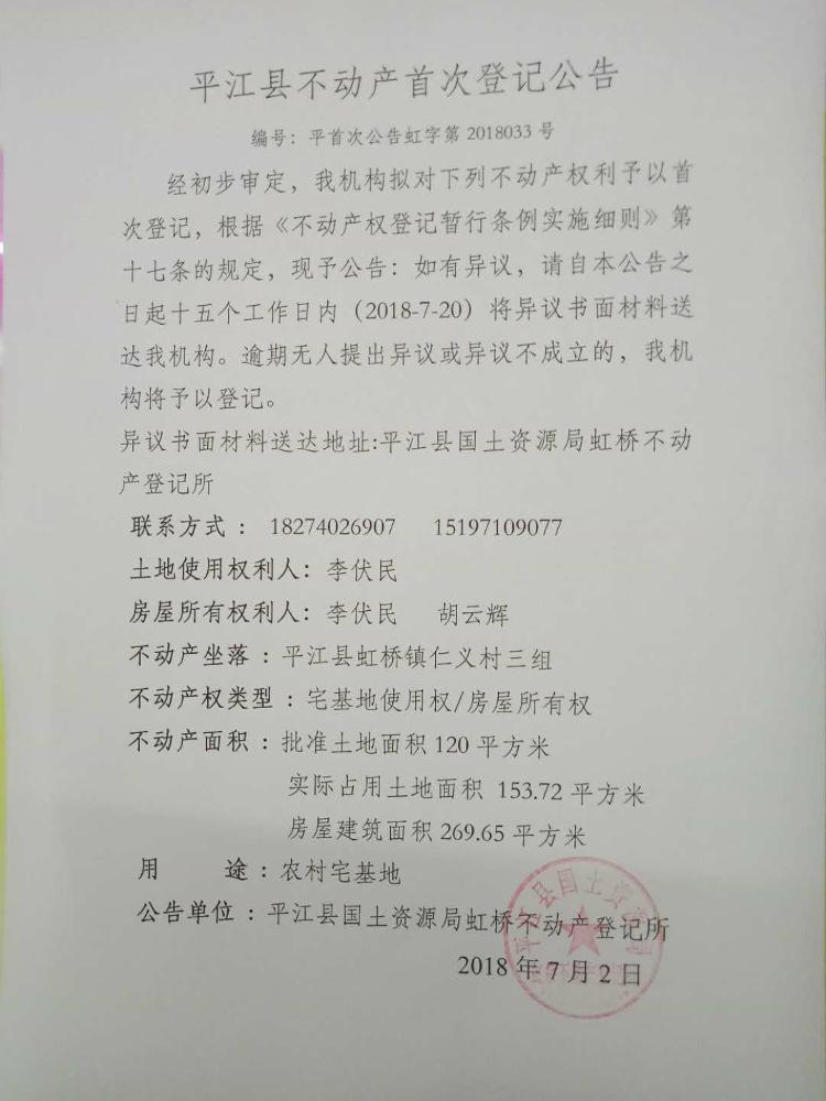 李伏民 胡云辉不动产首次登记公告平首次公告虹字第2018033号