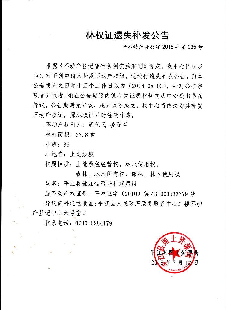 周优民 凌配兰林权证遗失补发公告平不动产补公字2018年第035号