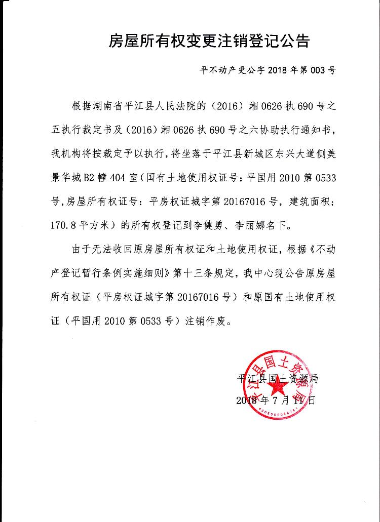 李健勇房屋所有权变更注销登记公告平不动产更公字2018年第003号