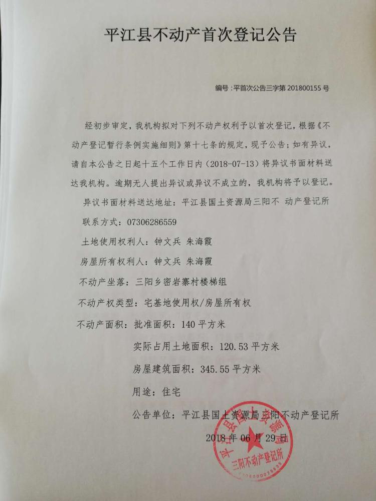 三阳乡 钟文兵 朱海霞 不动产首次登记